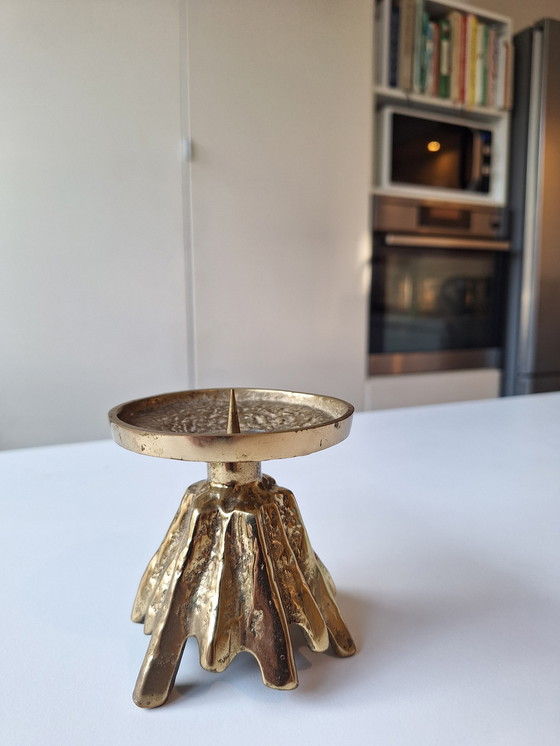 Unieke kaarsenhouder in brutalistische stijl van de gerenommeerde Duitse ontwerper Horst Dalbeck. Dit stuk staat bekend om zijn robuuste, organische voet die doet denken aan gesmolten metaal of grillige rotsformaties.