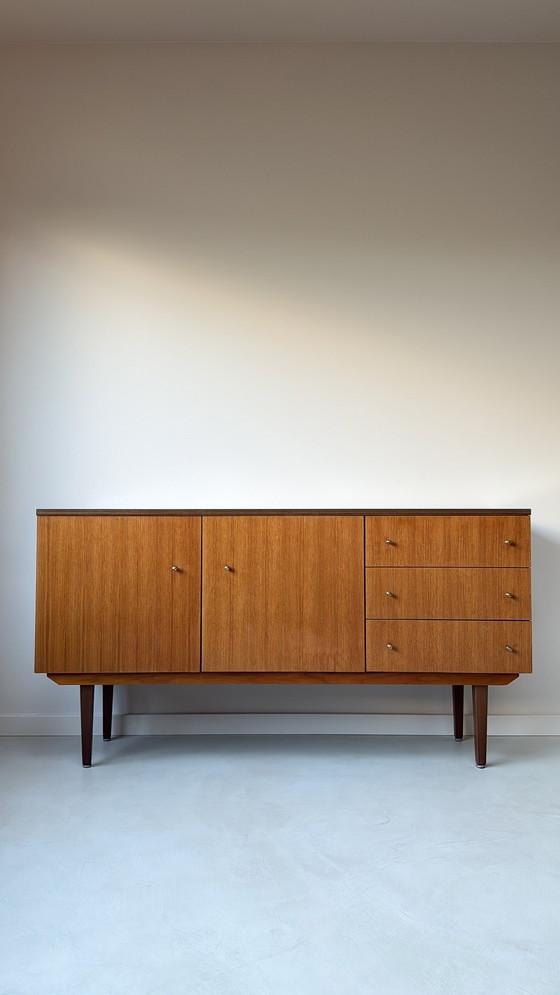Vintage houten dressoir van Heinz Kopp. Het dressoir heeft 2 deurtjes en 3 lades. Afmetingen: 150B x 40D x 80H cm. Het dressoir verkeert in goede vintage conditie, minimale gebruikerssporen horende bij de leeftijd, zie foto’s. Het dressoir kan enkel opgehaald worden in Maastricht of bezorging in overleg.