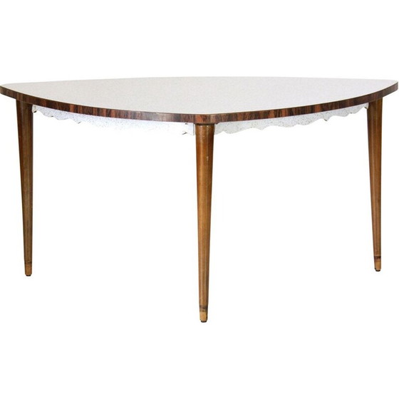 Een vintage salontafel met ongebruikelijke vormen uit de jaren 1950. Wit blad en massief houten frame. In opmerkelijke staat met slechts enkele ouderdomsspoortjes.
