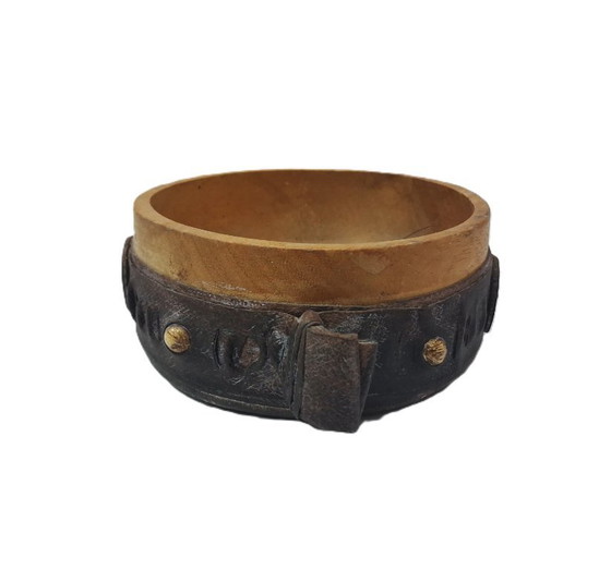 Deze prachtige vintage houten kom, versierd met complexe leren decoraties, getuigt van tijdloos vakmanschap. De rijke bruintinten en getextureerde leren accenten zorgen voor een opvallende visuele aantrekkingskracht, waardoor hij een perfecte aanvulling is op elke verfijnde setting.