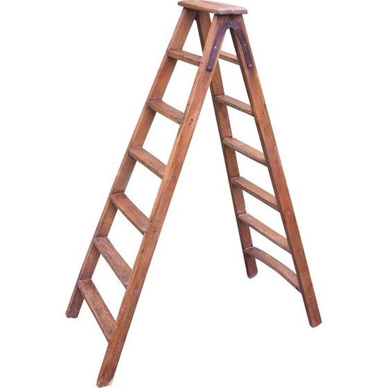 Een prachtige antieke houten ladder, bekend als schilderladder, daterend uit de jaren 1900, nu gebruikt als plank voor planten en boeken. Een zeldzaam detail is dat de laatste treden bovenaan samen een klein platform vormen (schildersladders hebben dit detail niet). Zeer decoratief, geeft een landelijke uitstraling aan je huis. In goede staat gezien de leeftijd, zoals te zien op de foto's: de onderste uiteinden van de poten zijn vermoeid, dus het is aan te raden om 10 cm af te zagen als je erop wilt klimmen (veiliger). Afmetingen: gesloten hoogte 155 cm, open hoogte 147 cm, onderbreedte 53,5 cm, bovenbreedte 33,5 cm, open diepte 110 cm, gesloten diepte 14 cm.