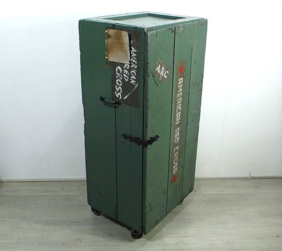 Vintage houten transportkist Amerikaanse Rode Kruis, origineel Shabby jaren 40 omgebouwd als kast op wielen