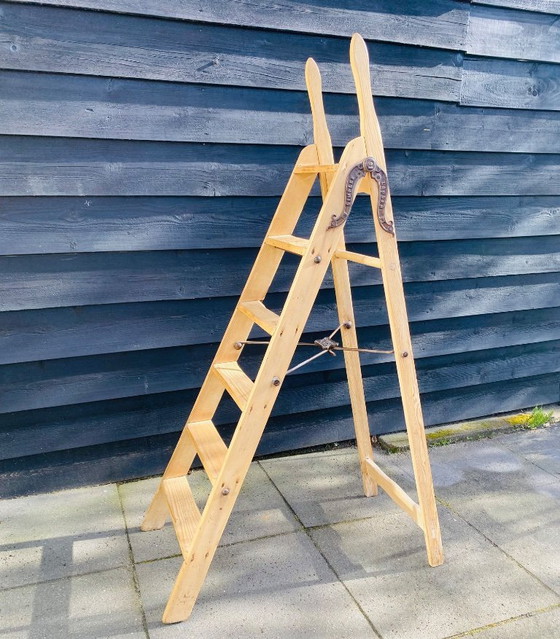 Houten vintage trap ,met gietijzeren ornamenten, waarschijnlijk Amerikaans. Zeer solide uitvoering. Ca. 1930.