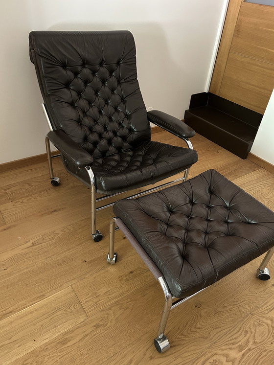 Zeldzame vintage Ikea fauteuil en voetenbank, ontworpen door Noboru Nakamura uit de late jaren 70.