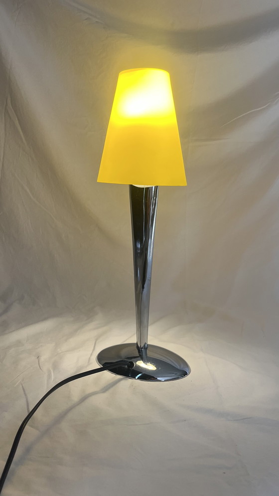 Het levendige gele glas zorgt voor een warme, diffuse gloed, terwijl de stevige zilverkleurige metalen voet stabiliteit en duurzaamheid garandeert. Het compacte ontwerp past moeiteloos in zowel moderne als retro-interieurs.