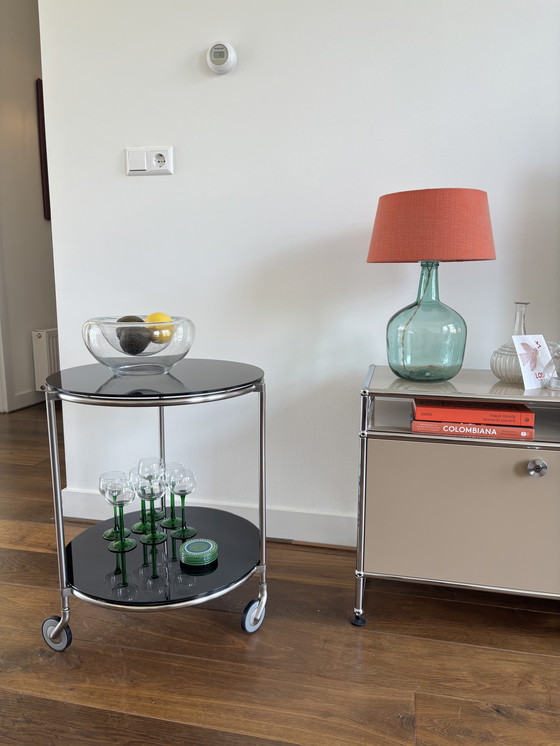 Vintage IKEA Strind bijzettafel / trolley met twee ronde glazen bladen en metalen frame op wieltjes. Iconisch space age / modernist design, ontworpen door Ehlen Johansson voor IKEA (jaren 90).