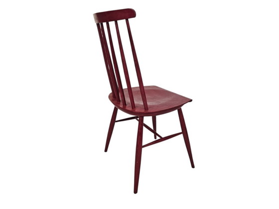 Vintage houten eetkamerstoel Ilmari Tapiovaara-stijl. De stoel is gemaakt van massief beukenhout in de rode lak. Speciaal rugleuningontwerp. In minimalistische Scandinavische stijl.