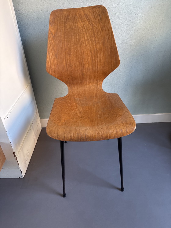 Vintage industriele stoel uit de jaren 60/70. Gebogen multiplex zitting en rug met zwart metalen onderstel. Mooie warme houtkleur met lichte gebruikssporen passend bij de leeftijd. Stevig en comfortabel. Leuk aan tafel, bureau of als decoratieve stoel.