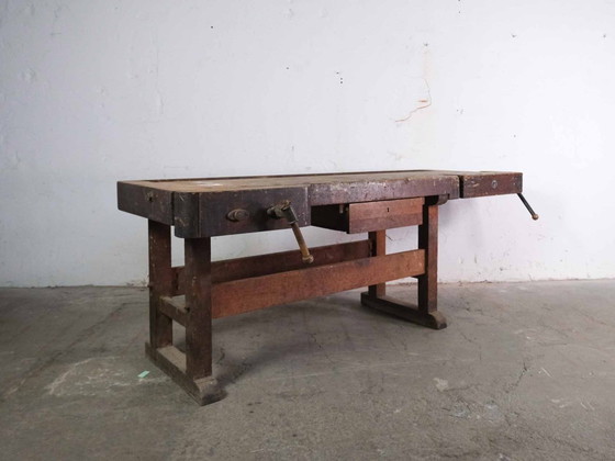 Deze vintage werkbank van Ulmia belichaamt de industriële charme van vervlogen tijden en is een robuuste en functionele aanwinst voor uw huis. De combinatie van massief hout en stevige metalen elementen geeft dit meubelstuk een indrukwekkende uitstraling die zowel in moderne als klassieke interieurs past.