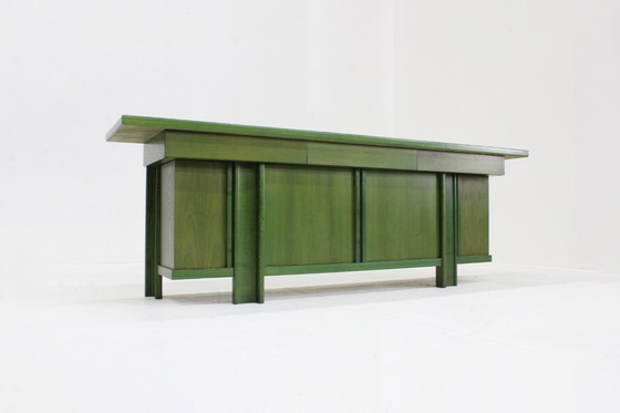 Vintage Italiaans dressoir uit de jaren 60, Italië. Houten dressoir in unieke groene kleur. Sculpturaal Italiaans design, vervaardigd uit hout. Een combinatie van Italiaans vakmanschap en architectonisch meubeldesign. Veel opbergruimte met zijwaarts openende deuren, 3 grote lades en 2 deuren in het midden. Het dressoir verkeert in zeer goede vintage staat met kleine gebruikssporen die passen bij de leeftijd.