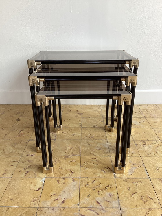 Ontdek de tijdloze elegantie van deze set vintage Italiaanse bijzettafels, perfect om een vleugje verfijning aan uw huis toe te voegen. Deze tafels, met hun rookglazen bladen en goudkleurige metalen frames, belichamen de charme van vintage Italiaans design.