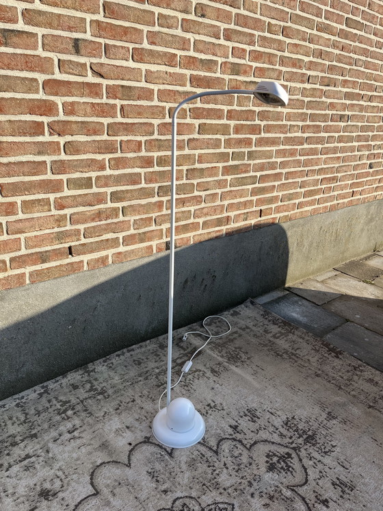 Vintage Italiaanse design vloerlamp van Brama Milano, mooie witte postmodern vloerlamp van begin jaren 80. Tijdloze designlamp om iets uit te lichten of naast een stoel als verstelbare leeslamp. Door de flexibele tube is de lampenkap alle kanten op te stellen, de lamp komt met een nieuwe old stock Osram Forsted halogeen lamp van 20W.