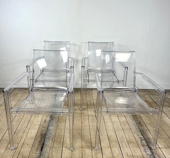Set van vier transparante fauteuils, geproduceerd door het Italiaanse bedrijf Driade, een iconische naam in de designwereld van de jaren 80, bekend om zijn kwaliteit en duurzaamheid.