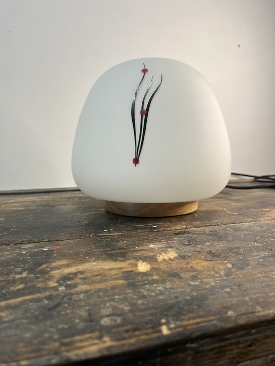 Vintage japandi mushroom tafel lamp uit de jaren 60, prachtig opaal glazen bol met scherp oosters decor erop. Bol is 20 cm doorsnede en circa 20cm hoog. Staat op hardhouten voetje met nieuwe E27 lamphouder en bedrading 1.5m met schakelaar. Lamp geeft mooi delicaat licht met de juiste led erin, prachtige echte jaren 60 mid century mushroom lamp