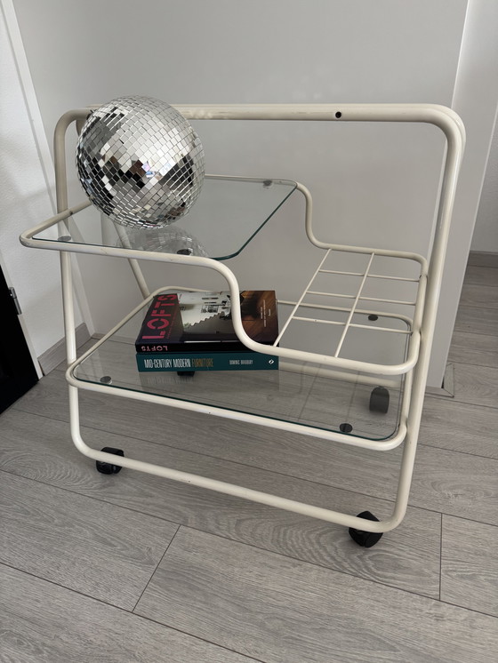 Stap terug in de tijd met deze charmante vintage barkar, een perfecte mix van stijl en functionaliteit. Het slanke metalen frame en de glazen planken bieden een minimalistische esthetiek die bij elke inrichting past.