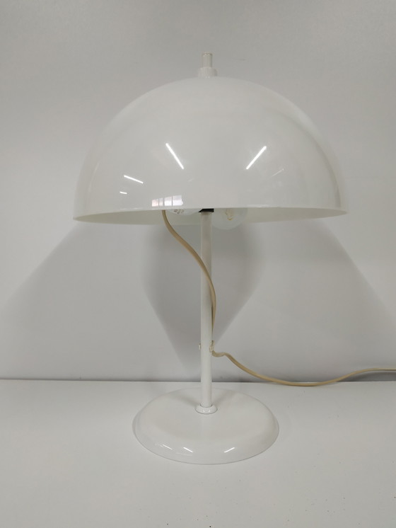 Schitterende verstelbare mushroom lamp met (gladde) kunststof kap, metalen frame (staander en voet) 2 spots en draad met aan/uit schakelaar. en klemmetje aan de stang. In de stijl van Verner Panton, Guzzini & Dijkstra lampen. Op de foto's ziet u de lamp met verschillende lichtbronnen en geplaatst in verschillende lichtomstandigheden (vol licht en met lampen eromheen uit). Prachtige sfeer of leeslamp. Gezien de leeftijd in zeer goede conditie. Aanvullende afmetingen: Hoogte bij half naar beneden: 25 cm (kaphoogte vanaf de tafel), volledig uit/omhoog 44 cm. Lichtbronnen/ lampjes worden niet meegeleverd ivm brandveiligheid. De kap kan aan de binnenkant worden omhooggeduwd en naar beneden via een kunststof deel, dat houdt de kap ook op de plek. Op dit moment hebben we ook nog een 2e lamp in een gelijke stijl, niet dezelfde. Als u interesse heeft in beiden stuur gerust een bericht, er kan hierover een nette prijs worden gemaakt.