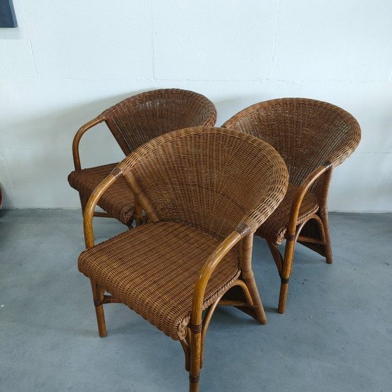 Set van de 3 prachtige vintage handgemaakte stoelen met bijzondere lange rok (rug). Vrij uniek model, design van Rohé Noordwolde. In ieder geval 1 stoel is gemerkt/gelabelled, de vorige eigenaar durfde ons te garanderen dat ze allemaal van Rohé zijn. Wij zetten dit er specifiek even bij om mogelijke misverstanden te voorkomen. Rohé Noordwolde was een Nederlandse fabrikant van vintage rotan meubelen, die ook tegenwoordig nog populair zijn en te vinden in winkels en op online platforms voor vintage meubelen. Met iconische ontwerpen en designers, zoals Gerard van de Berg. Deze stoelen zijn in overall nette conditie. Zeker niet vrij van wat breukjes, maar overall gewoon prima staat na ruim 50-60 jaar. Neem voor bezorgkosten even contact met ons op. let op: alle afmetingen die vermeld zijn, gelden voor 1 stoel. Bij bezorging kunnen dus kosten afwijken aangezien het hier gaat om een set van 3 stuks (prijs voor de set).