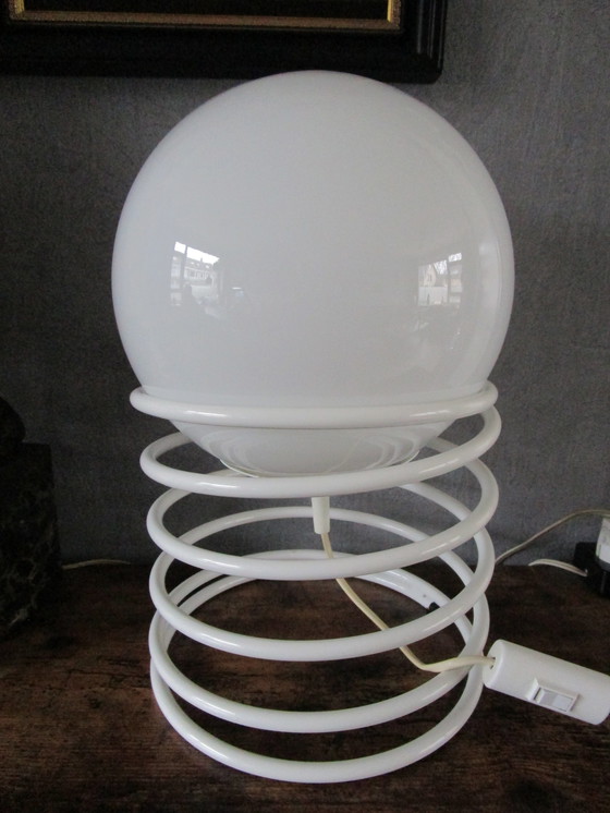 Vintage jaren 70 WOJA tafel bollamp,in perfecte staat! Maten: 40cm hoog. ø glazen bol ca 25cm. ø spiraal ca 24cm. Komt met een lang snoer en schakelaar. Vewrzenden op eigen risico.