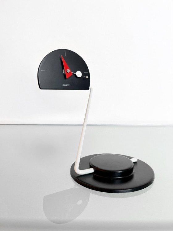 Ontdek deze unieke tafelklok van Nicolai Canetti voor Artec. Een iconisch stuk uit de postmoderne 80s designperiode, perfect voor liefhebbers van minimalistische en avant-gardistische interieurs. De strakke vormen, opvallende rode wijzers en het speelse geometrische ontwerp maken deze klok niet alleen functioneel, maar ook een waar kunstobject voor op bureau of dressoir. Een must-have voor verzamelaars van vintage design. De klok verkeert in nette vintage staat met wat ouderdomskenmerken. Foto's maken deel uit van de beschrijving.