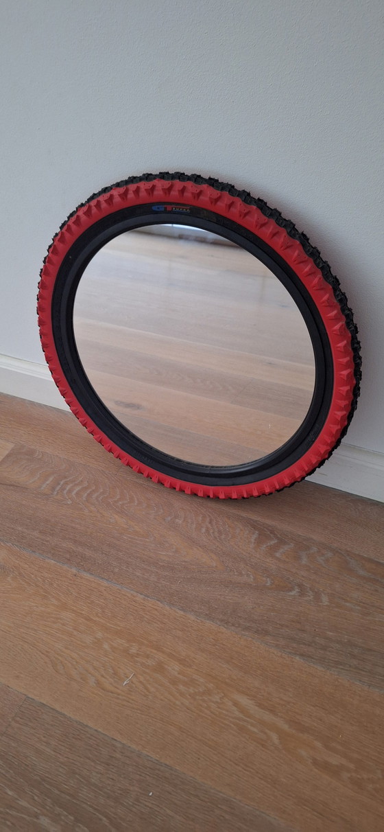 Vintage IKEA Volda-fietsbandspiegel in rood en zwart. Perfect voor de fietsliefhebber in je leven. Afkomstig uit de jaren 90. Doorsnede is 50 cm. Te gek item.