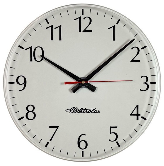 Deze industriële wandklok werd in de jaren negentig geproduceerd door Elektročas in Tsjechië. De klok heeft een witte plastic wijzerplaat en een gebogen, transparante plastic glazen afdekking. Het uurwerk werkt op batterijen en heeft slechts één AA-batterij nodig. De klok weegt 0,6 kg.