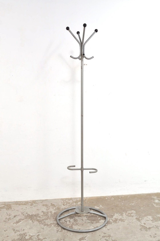 Mooie vintage kapstok met parapluhouder uit de jaren 60. De staande kapstok heeft 8 haken (draaibaar), waarvan 4 met een kogelknop.