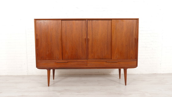 Artikelnummer: 211500 Breng Deense elegantie in huis met dit vintage highboard, ontworpen door Omann Junn voor Gunni Omann in de jaren '60. Dit is model nummer 13. Dit vintage meubel biedt genoeg opbergruimte achter de 4 schuifdeuren en 2 ruimte lades. Dankzij de kenmerkende grepen en strakke vormgeving is deze vintage wandkast een eyecatcher in ieder interieur! Achter de linker schuifdeur vind je 6 lades. Achter de overige schuifdeuren vind je verstelbare planken. Vanwege de ruime indeling, is de kast goed te gebruiken als servieskast. De achterkant van de kast is mooi afgewerkt, wat de kast ook geschikt maakt als vintage roomdivider. Ontwerp periode: 1950 - 1960 Stijl: Mid century modern - Scandinavisch design - Deens design Materiaal: Teak (fineer) Conditie: In goede vintage staat Land van herkomst: Denemarken Ontwerper: Omann Jun Fabrikant: Gunni Oman Afmetingen: Breedte: 180 cm Hoogte: 120 cm Diepte: 45,5 cm