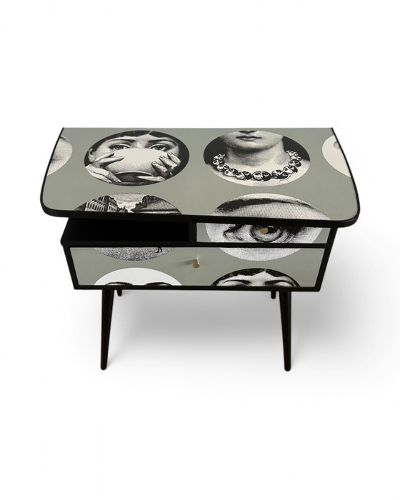Dit unieke vintage kastje is bekleed met het iconische ‘Tema e Variazioni behang’ van Fornasetti, met het raadselachtige gezicht van Lina Cavalieri, een tijdloze muze in kunst en design.