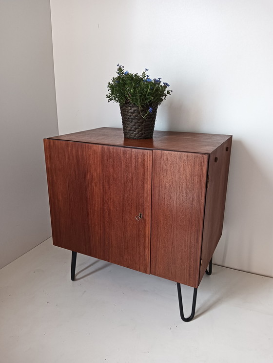 Zoals de ene deur die breder is dan de andere. Werkend slotje, spiegel achterin en in hoogte verstelbare glazen plank. Hout zeer mooi, conditie heel goed. De elegant gevormde pootjes zijn eronder gezet, maar mooie combinatie.
