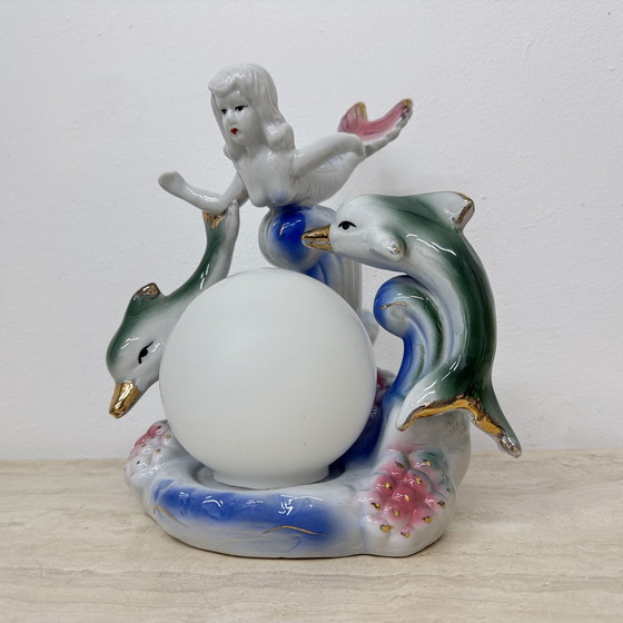 Vintage keramieken tafellamp met zeemeermin en dolfijnen, jaren 1980