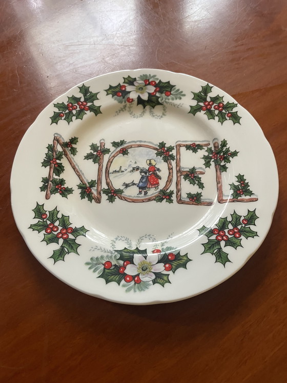 Geniet van deze gezellige feestdagen met deze kerstborden. NOEL in het midden met een meisje, jongen en hond in het midden van de "O" van NOEL. Versierd met hulst en klimop langs de rand. Deze feestelijke borden, oorspronkelijk gekocht in Londen, zijn in perfecte staat. Uit circa 1980.