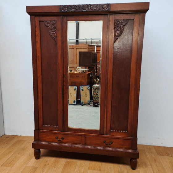 Vintage hangkast, kledingkast. Deze prachtige spiegelkast heeft twee deuren en een vast paneel met daarachter een roede en legplankjes. De middelste deur van deze hangkast zijn voorzien van prachtige facet geslepen spiegel. Onder de deuren zitten ook nog twee lades. Een geweldige kast waar je lekker veel in kwijt kunt. De spiegel kan verweerde plekken hebben wat past bij zijn leeftijd.