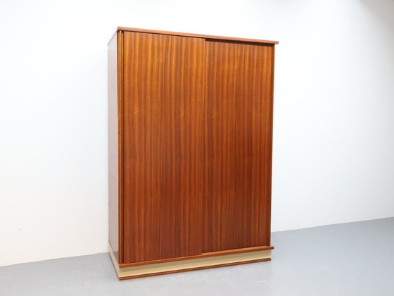 Nette vintage kledingkast voorzien van 2 schuifdeuren. De deuren lopen beide soepel. Volledig hanggedeelte. Dichte voet. Demontabel voor transport. In nette staat met 2 kleine gaatjes in het zijpaneel. Hoogte 170 cm, breedte 120 cm, diepte 57 cm.