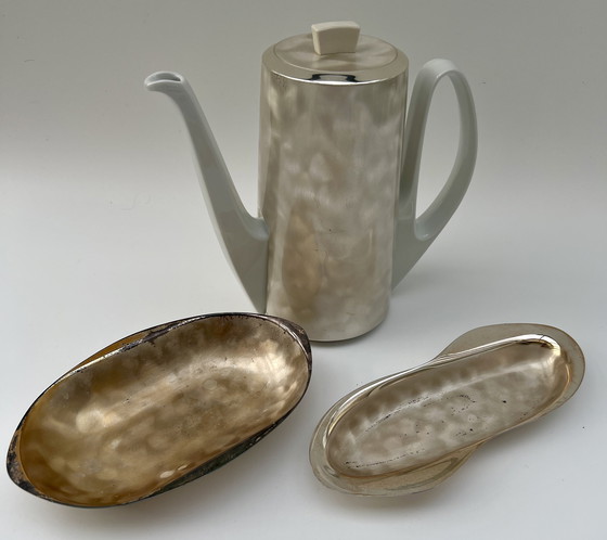 Een elegante porseleinen theepot met een afneembare, hittebestendige metalen hoes, plus twee prachtig gevormde metalen kommen met een gehamerde afwerking. Een waar designstuk uit de jaren 50/60 – ideaal voor in de keuken, vitrinekast of als verzamelobject.