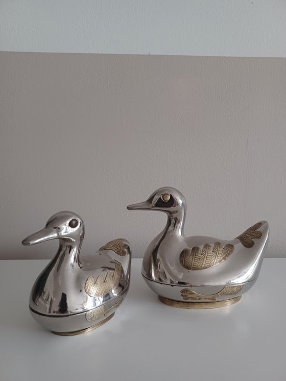 Vintage koppel tinnen eendjes met koper. Opbergdoosjes.