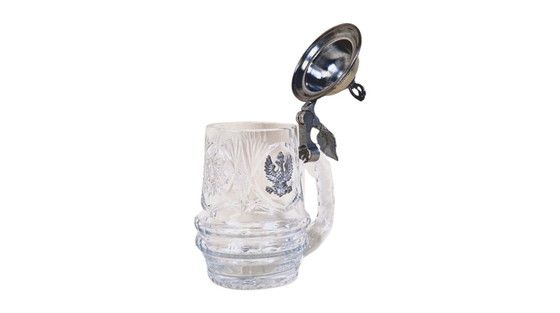 De pul is rijk gedecoreerd met een adelaar-embleem en heeft een klassiek Europees ontwerp dat doet denken aan traditionele Duitse bierpullen. Het zware kristal zorgt voor een luxe uitstraling en mooie lichtreflectie.