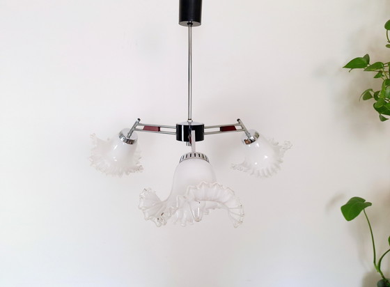 Vintage kroonluchter uit de jaren 70, gemaakt in Joegoslavië. Deze mid-century lamp heeft een gealuminiseerd frame met drie prachtige tulpvormige opaalglazen kappen. De unieke lampenkappen zijn met de hand gemaakt.