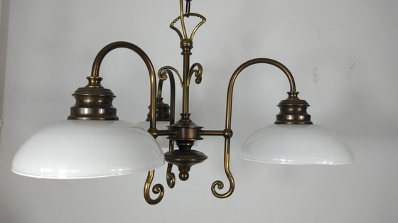 Breng een vleugje nostalgie in je huis met deze prachtige vintage kroonluchter in messing. De warme glans van het messing gecombineerd met de elegante witte glazen lampenkappen maakt deze kroonluchter een echte blikvanger.