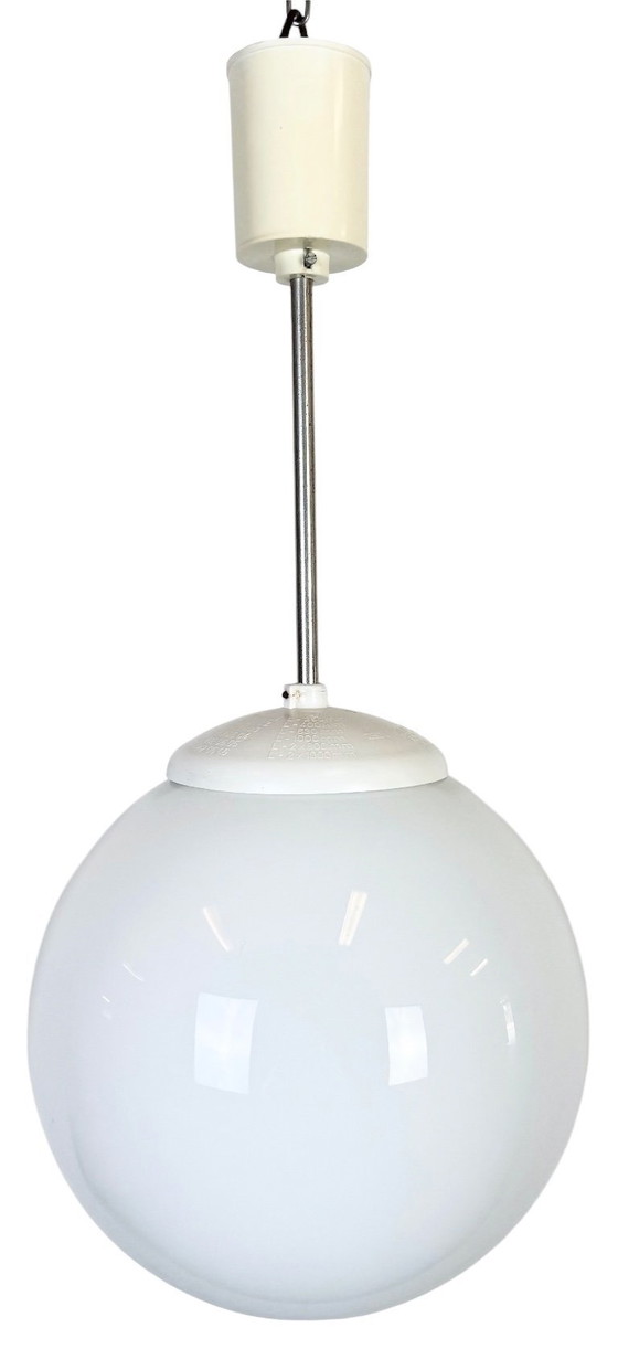 Vintage kroonluchter gemaakt door Elektrosvit in voormalig Tsjecho-Slowakije in de jaren 60. Gemaakt van melkglas, chroom en bakeliet. De porseleinen fitting vereist standaard E27/E27-lampen. Nieuwe bedrading. De diameter van het glas is 24 cm. Hoogte: 50 cm. Gewicht: 1 kg.