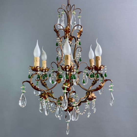 Vintage kroonluchter met zes lampen, versierd met gouden bladeren en kristallen, in klassieke Italiaanse stijl.