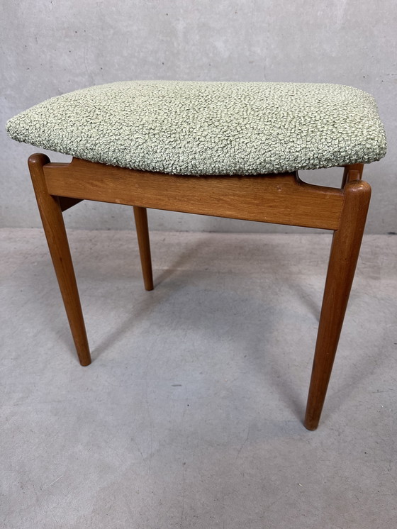 Vintage voetenbank of kruk. Professioneel voorzien van nieuwe singels, schuim en aangename zachtgroene zetelstof. Ruim zitvlak. Hoogte: 53cm. Breedte: 52cm. Diepte: 37cm. Zithoogte: 53cm. In mooie staat. Afhalen, koerierdienst of verzenden op aanvraag (op basis van woonplaats en afmetingen).
