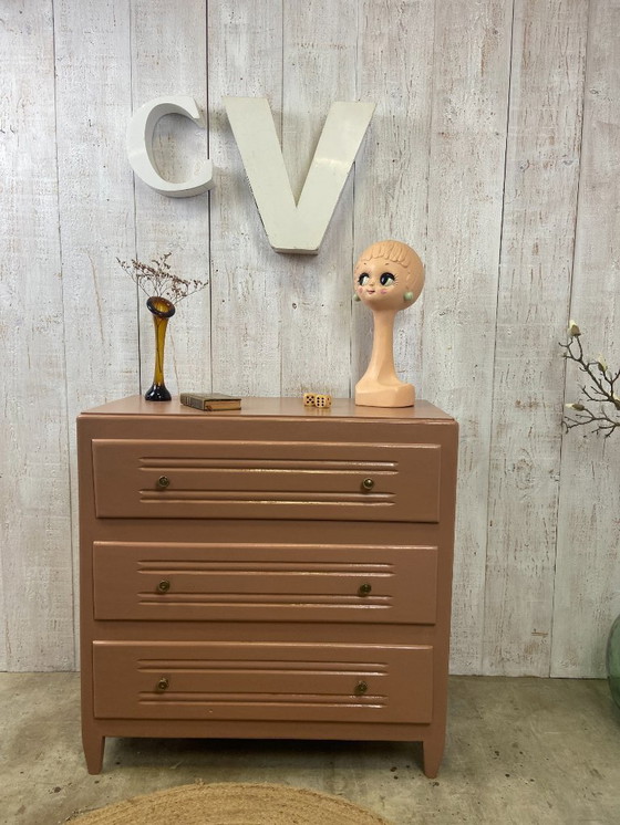 Een elegante commode uit de late jaren 50/begin jaren 60 die we in Biarritz hebben gevonden. We hebben hem gedesinfecteerd, ontdaan van oude verf, behandeld, geverfd en tot slot afgewerkt met een watergedragen lak. De kleur komt overeen met Pantone 2025. De knoppen op de drie lades zijn origineel.