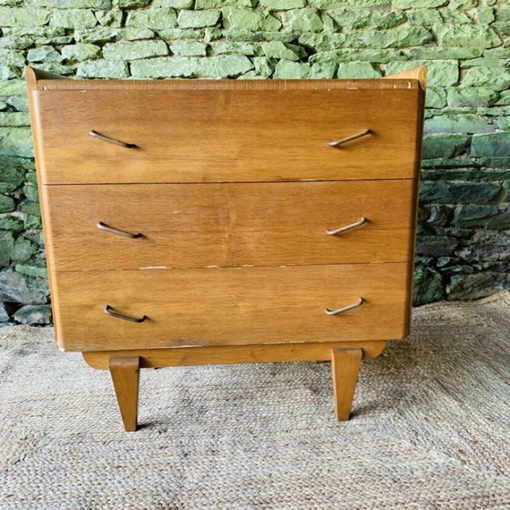 Deze commode met 3 lades is een echt icoon van Frans design uit de jaren 60 en heeft een verleidelijk retrosilhouet en strakke lijnen.