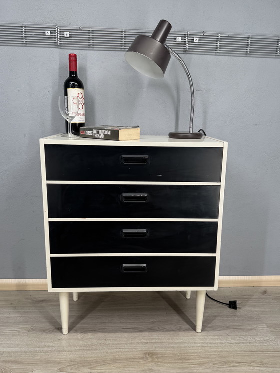 Zoekwoorden: vintage, ladekast, retro, zwart wit, opbergkast, mid century, design