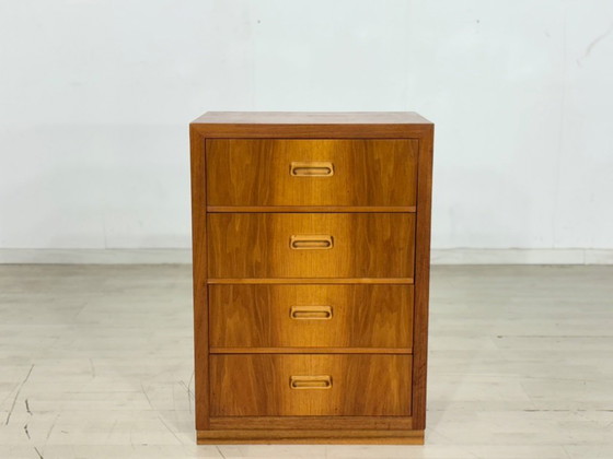 Te koop: een prachtige vintage ladekast van notenhout met vier laden in goede staat.