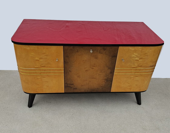 Prachtige vintage ladekast - enfilade met 2 zijdeuren die uitkomen op een compartiment met binnenlade + 1 centrale kanteldeur die uitkomt op een zeer groot compartiment. Glimmend granaatkleurig laminaat bovenblad, geverniste houtfineer romp. Het meubel is erg zwaar. De binnenkant is gekleurd in lak of laminaat.