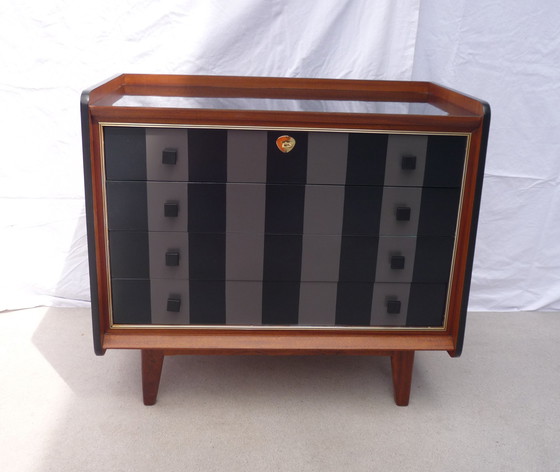 Prachtige vintage commode met 4 laden op 4 poten (niet demonteerbaar). Bovenblad met glanzend zwarte laminaatranden, gelakte houten zijkanten, gelakte ladefronten en gekleurd interieur. De 1e lade is afsluitbaar (sleutel meegeleverd).