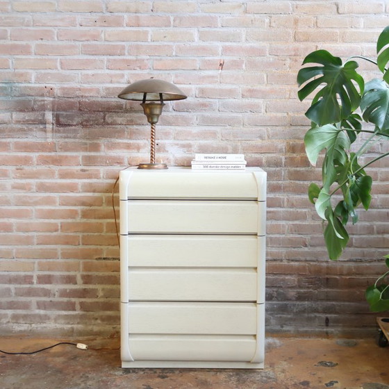 Leuke ladekast uit de 80s /90s met greeploze lade met ronde vormen. De ladekast is in een wit / creme kleur waarbij je de houtnerf wel nog ziet. Lade lopen heel soepel en onderste laden zijn groter waardoor je makkelijk veel kan opbergen. Beetje in de nieuwe stijl die je ook bij hk living ziet. Van het merk Moser. In goede vintage staat beetje offwhite vergeeld en paar kleine gebruikspore zie foto's.