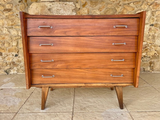 Het meubel is gemaakt van hout met een levendige, warme, rijke afwerking van walnootfineer. De ladekast staat op 4 taps toelopende poten en heeft 4 volledig functionele, afgeschuinde lades met hun 8 originele, chroomkleurige handgrepen. De lades zijn schoon, met enkele zeer lichte gebruikssporen, en de afmetingen zijn: B: 86 cm x D: 36,5 cm x H: 11,5 cm.