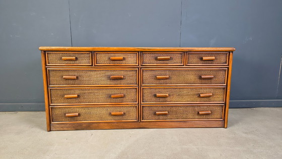 Elegante houten en rotan commode met 8 lades.